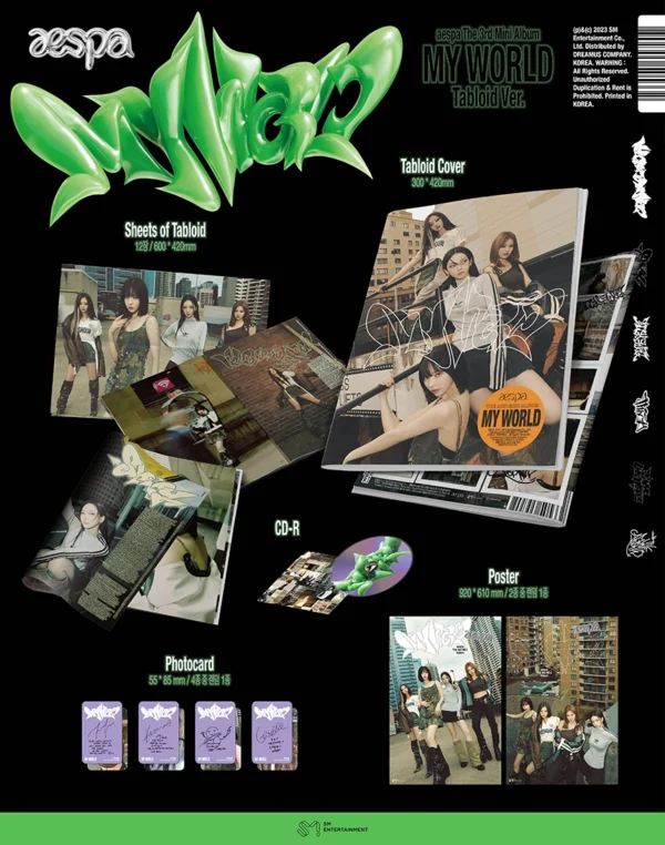 aespa – My World (3rd Mini Album) – Tabloid Ver. to oryginalne wydanie inspirowane stylistyką magazynów i tabloidów, które wyróżnia się odważną, przyciągającą wzrok oprawą graficzną. Wersja Tabloid zawiera wyjątkowe materiały wizualne, które podkreślają świeży, letni koncept albumu. My World prezentuje bardziej popowe, melodyjne brzmienie aespa, jednocześnie zachowując ich unikalny futurystyczny charakter. To idealna propozycja dla fanów, którzy chcą wzbogacić swoją kolekcję o nietypowe, designerskie wydanie. Doskonały produkt do sklepu – estetyczny, popularny i chętnie wybierany przez miłośników aespa oraz kolekcjonerów K-popu.