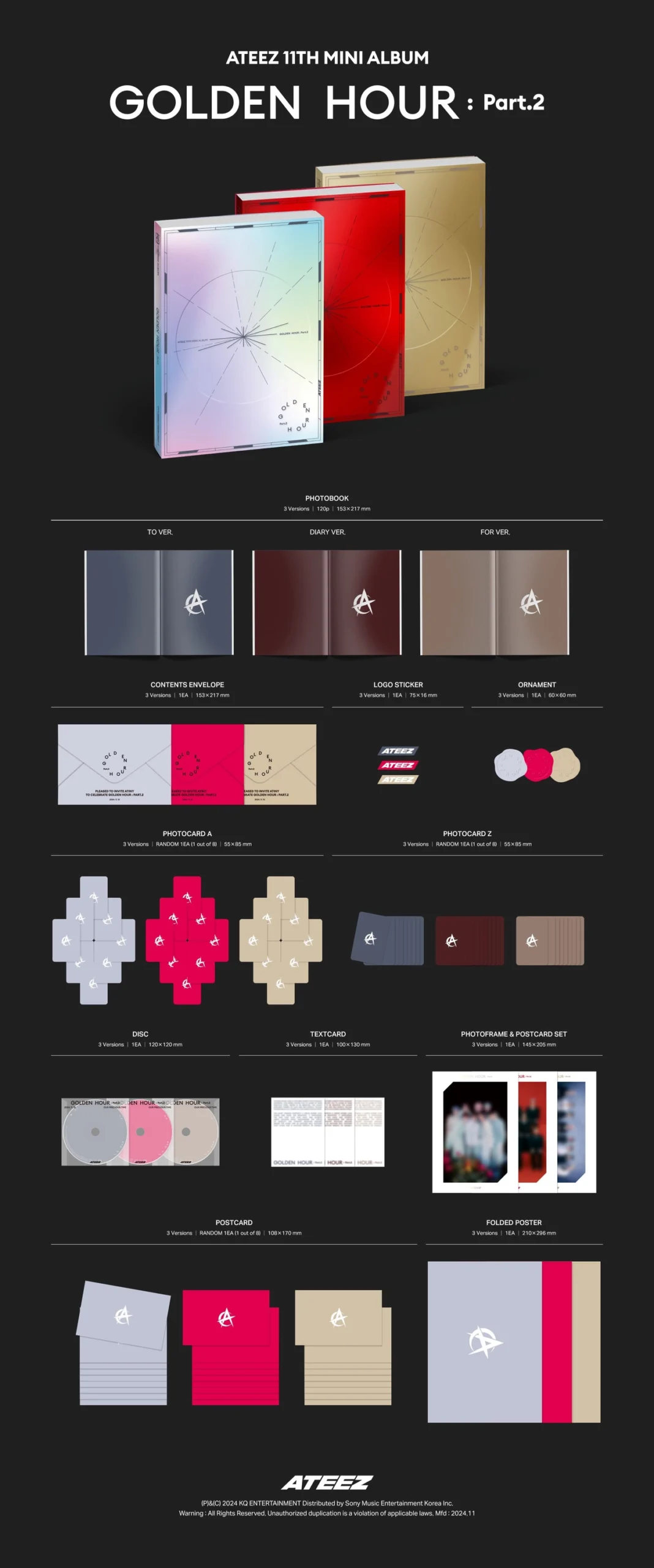 11 mini album ATEEZ „Golden Hour : Part.2” to kontynuacja niezwykłej muzycznej podróży zespołu, pełnej emocji, energii i artystycznej ekspresji. Album ukazuje dojrzalsze brzmienie ATEEZ, łącząc potężne rytmy z głębokimi tekstami o pasji, marzeniach i nieustannym dążeniu do celu. Każdy utwór tworzy spójną opowieść o sile, odwadze i świetle, które towarzyszy im w drodze na szczyt. „Golden Hour : Part.2” to idealna propozycja dla ATINY i wszystkich fanów nowoczesnego, pełnego emocji k-popu.
