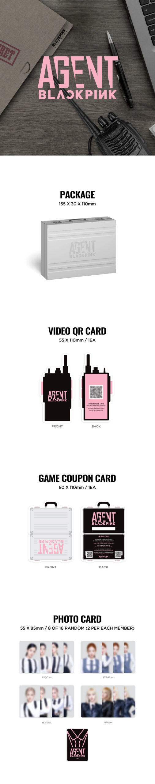 BLACKPINK – BLACKPINK THE GAME PHOTOCARD COLLECTION – AGENT BLACKPINK to oficjalna kolekcja photocardów inspirowana popularną grą BLACKPINK THE GAME. Zestaw wyróżnia się motywem AGENT BLACKPINK, podkreślającym unikalny i dynamiczny styl zespołu. W środku znajdują się losowe photocards BLACKPINK, idealne dla kolekcjonerów i fanów K-popu. Produkt został wykonany z dbałością o detale i wysoką jakość materiałów. To doskonały wybór dla osób poszukujących oryginalnego merchu BLACKPINK. Kolekcja świetnie uzupełni każdą kolekcję photocardów K-pop i sprawdzi się jako wyjątkowy prezent dla fana zespołu. Produkt jest nowy, fabrycznie zapakowany i pochodzi z oficjalnej dystrybucji. Dodaj AGENT BLACKPINK Photocard Collection do swojej kolekcji już dziś!