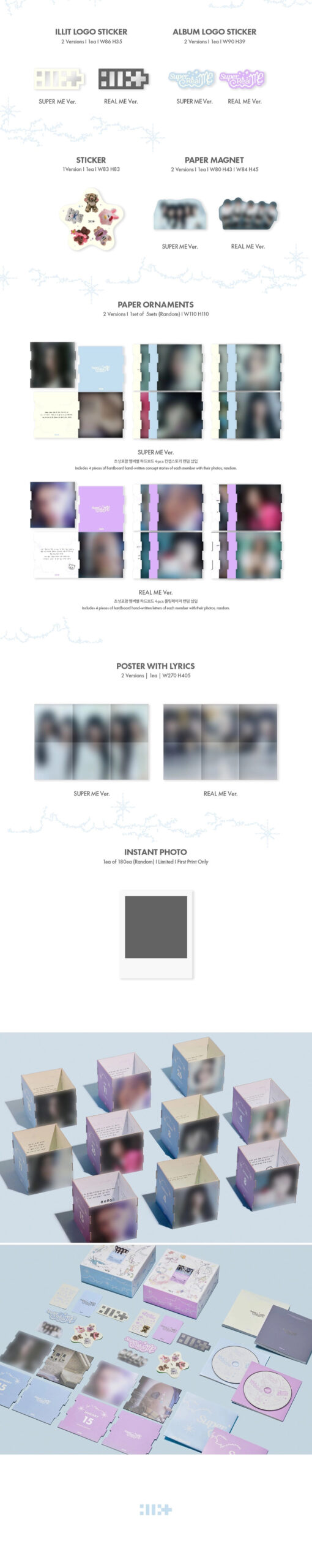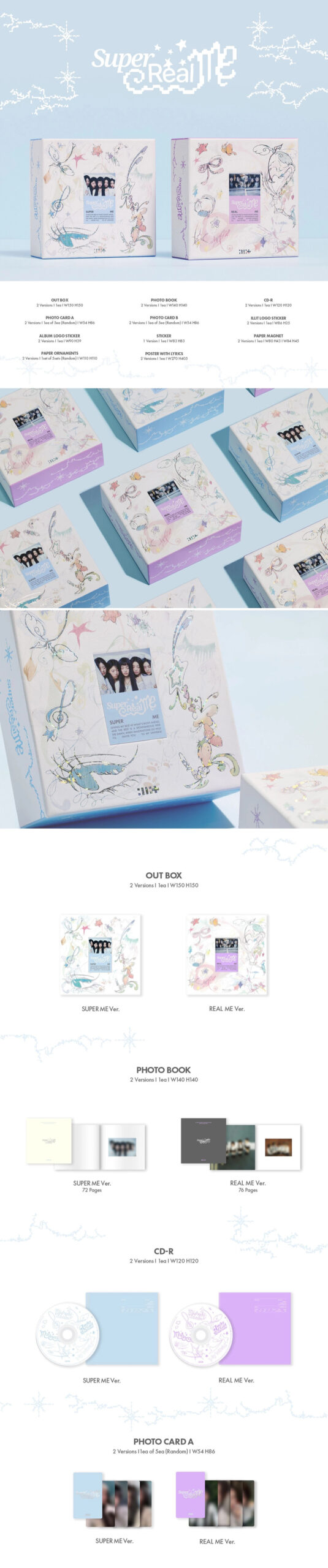 Stylowy mini album debiutanckiej grupy ILLIT „Super Real Me” to idealna propozycja dla fanów szukających unikatowych wydań kolekcjonerskich. Produkt dostępny jest w dwóch wersjach – REAL ME oraz SUPER ME, z których każda wyróżnia się charakterystycznym designem i dopracowaną oprawą wizualną. Album zachwyca estetyką, świeżym stylem oraz wysoką jakością wykonania, dzięki czemu świetnie prezentuje się w każdej kolekcji K-popowej. To doskonały wybór zarówno dla kolekcjonerów, jak i osób szukających oryginalnego, efektownego prezentu. Eleganckie wydanie „Super Real Me” podkreśla wyjątkową tożsamość oraz energię ILLIT.