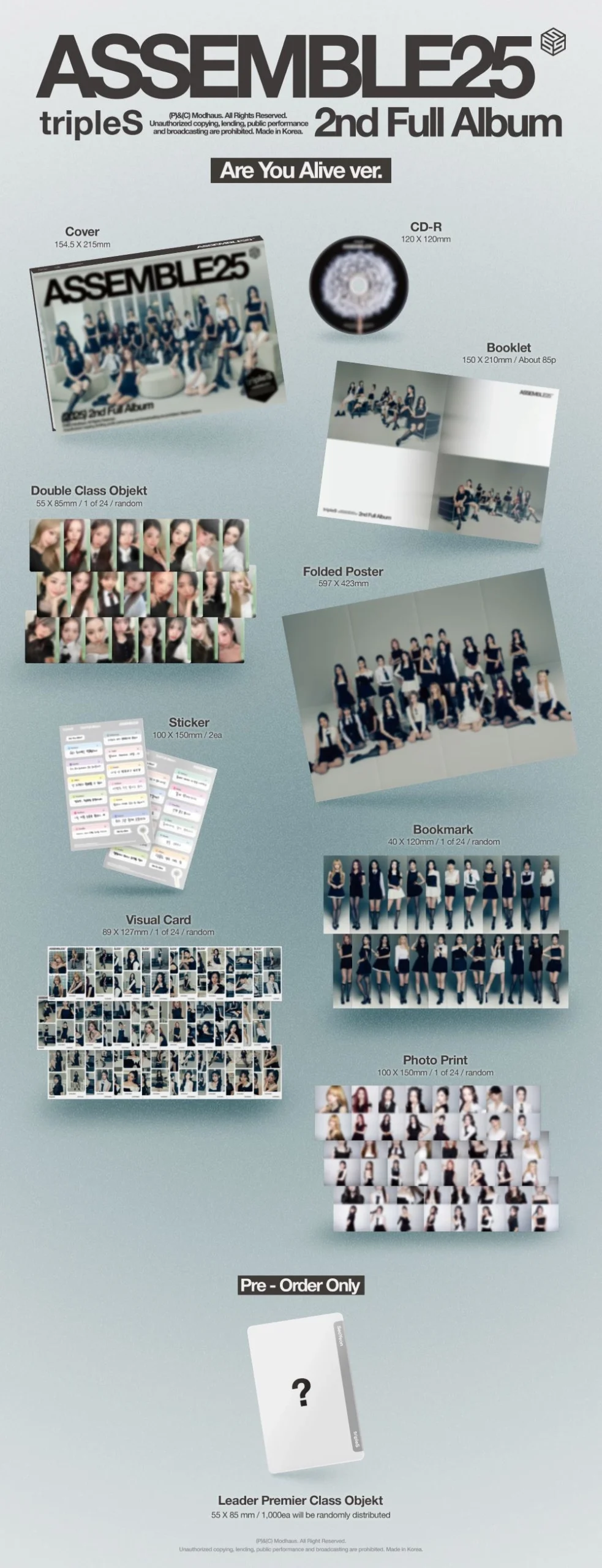 Drugi pełny album tripleS – ASSEMBLE25 – to dynamiczny projekt ukazujący siłę kolektywu i indywidualność każdej z członkiń. Album łączy świeże, nowoczesne brzmienia z konceptualną głębią, podkreślając unikalną tożsamość zespołu i jego otwartość na eksperymenty. Wersje Are You Alive i We So Alive przedstawiają dwa kontrastujące podejścia do tego samego pytania – o obecność, energię i prawdziwe „ja” – zarówno w warstwie muzycznej, jak i wizualnej. To wyjątkowe wydanie dla fanów, którzy cenią odważne koncepcje i muzyczną różnorodność.